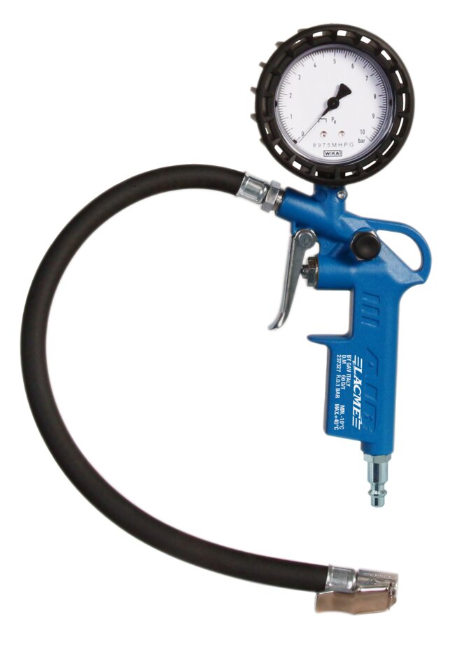 Pistolet de gonflage N - Flexible 35cm Ø6x11mm, Poinçonné et homologué CE, Embout norme AFAQ, Protection enrobante du manomètre contre les chocs, Manomètre Ø63mm: 0-10bar, Echelle de graduation I-0,1 bar, livré avec un raccord rapide